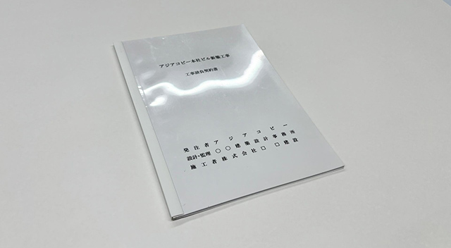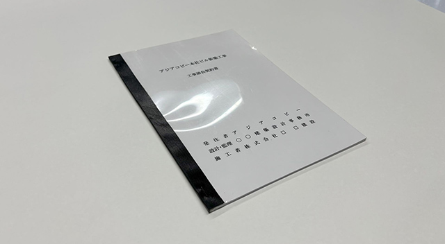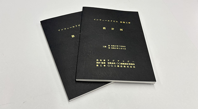 アジアコピーが最も多くの実績を誇るのが製本です。図面や契約書、文集、報告書などを1冊の書物として製本します。強みとしているのは速さと品質と対応力です。条件によりますが、最速で即日対応できる体制が整っており、時間が限られた案件にも対応できます。また、用紙や接着剤の種類にこだわることで、開きやすくて耐久性が高い美しい製本に仕上がります。表紙のラミネート加工、インデックスの貼付、契約図書や竣工図書に使用される黒表紙金文字製本など、多様な要望にお応えいたします。